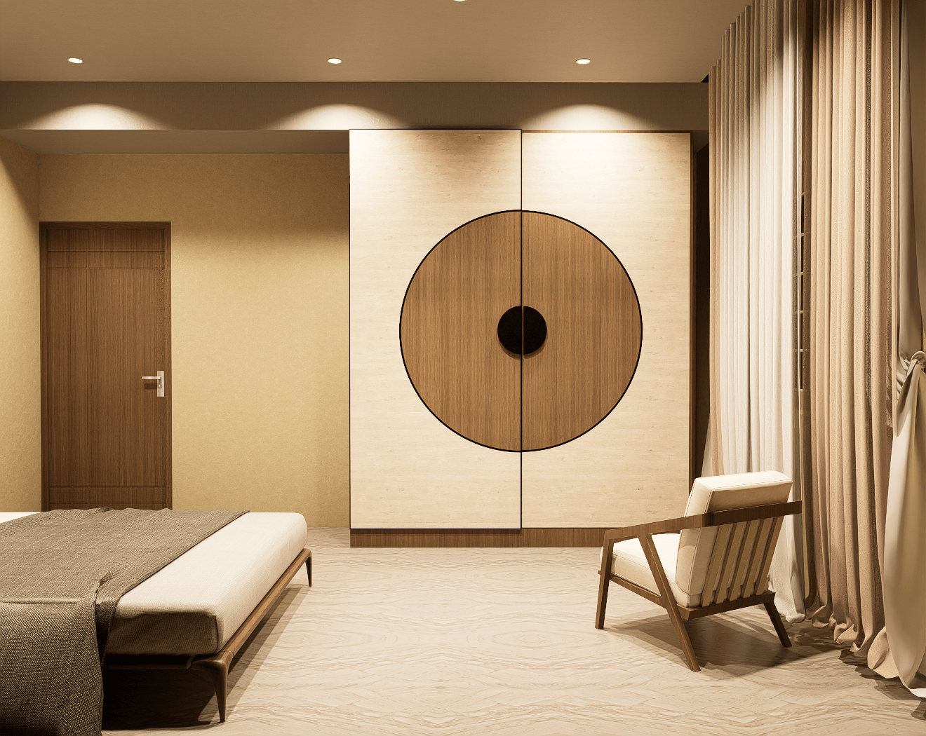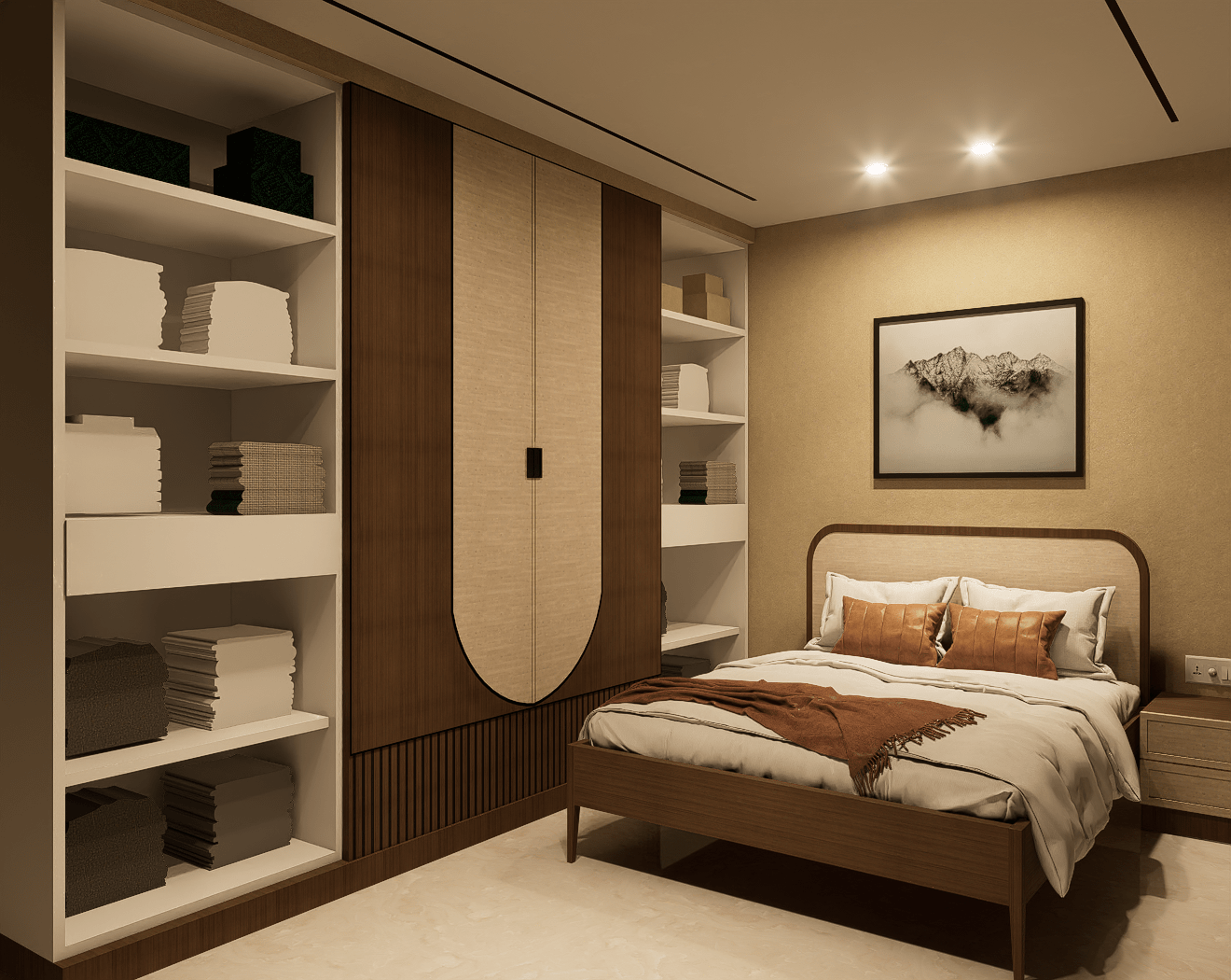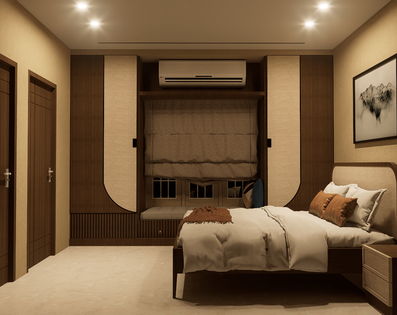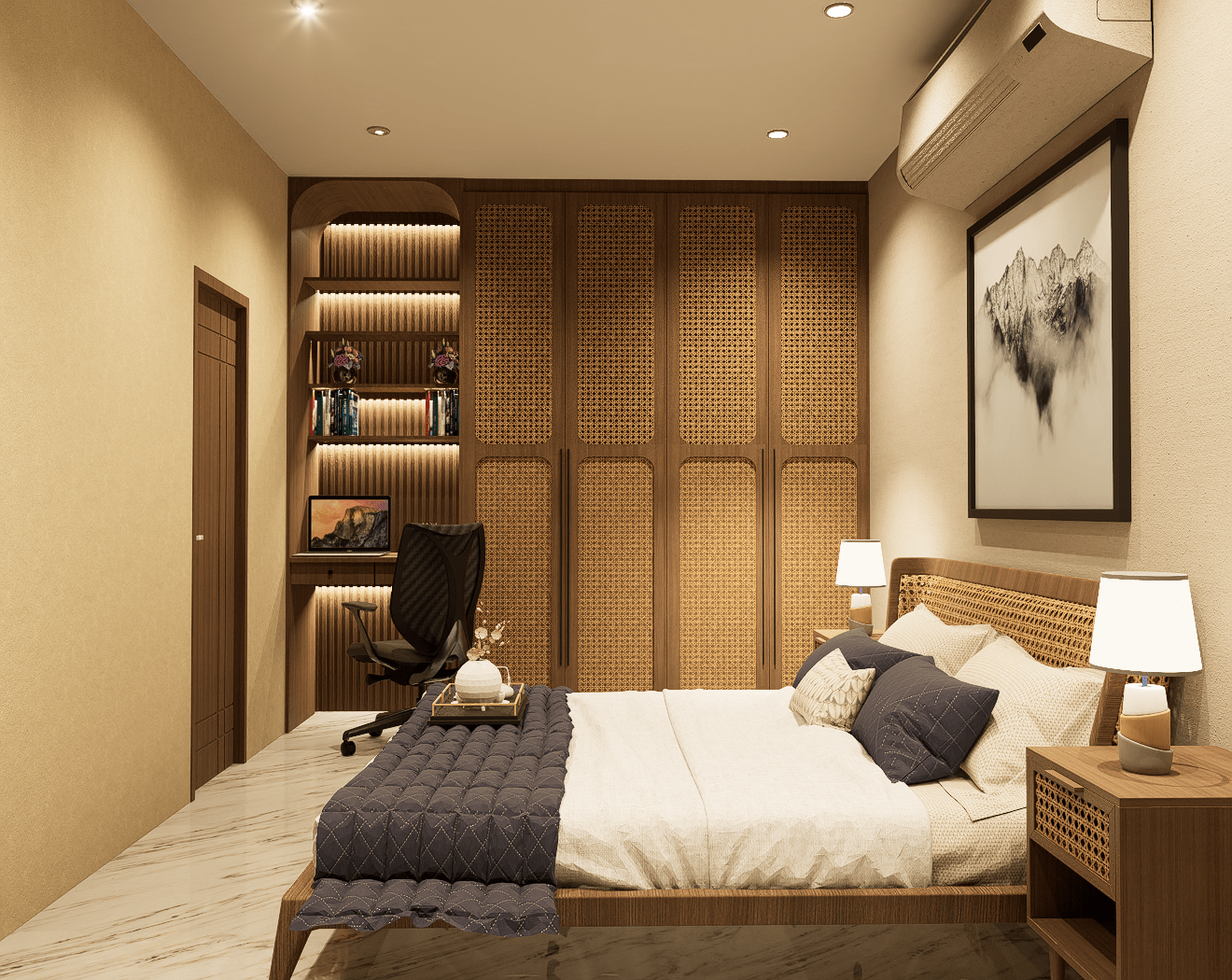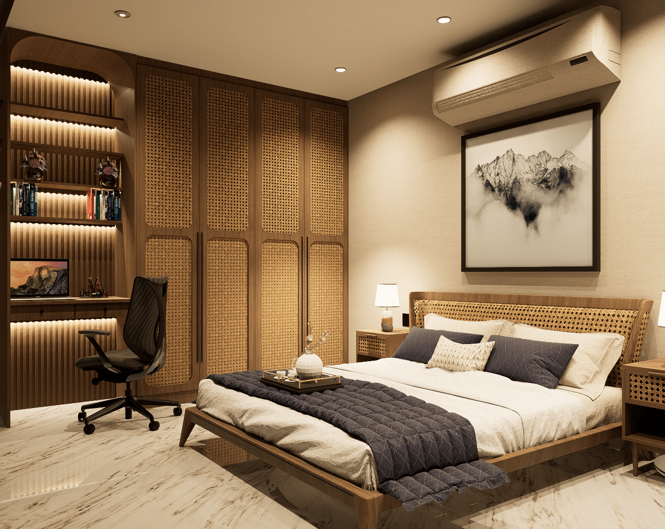 Bedrooms continue the warm, natural palette — one featuring a study table with sleek ledges for display, and another with cosy bay seating for relaxation.
