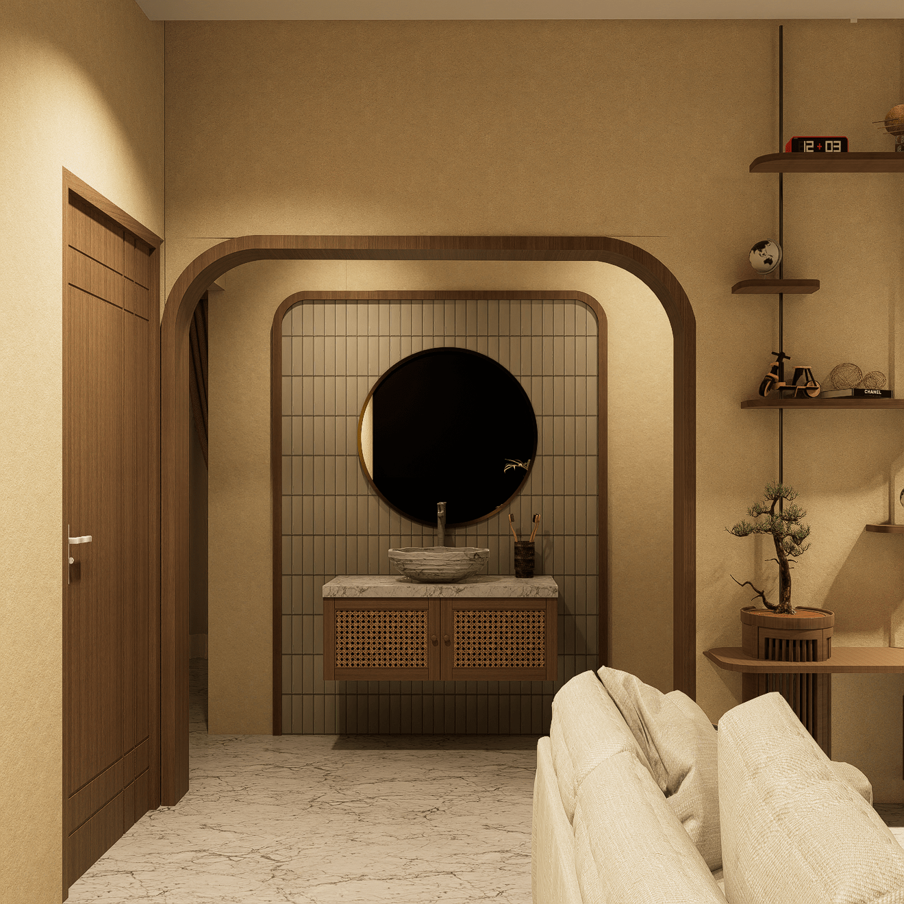 The Warm Wood Terra is a modern-contemporary home in soft creams, beiges, and warm woods, enriched with rattan textures. The journey begins at a serene foyer with a grand Buddha statue, leading to a sleek grey-toned kitchen and a living area with a cream sofa, greenery, and a statement TV console with ledges. A pooja unit with rattan doors adds tradition, while the washbasin with a round mirror blends style and function.