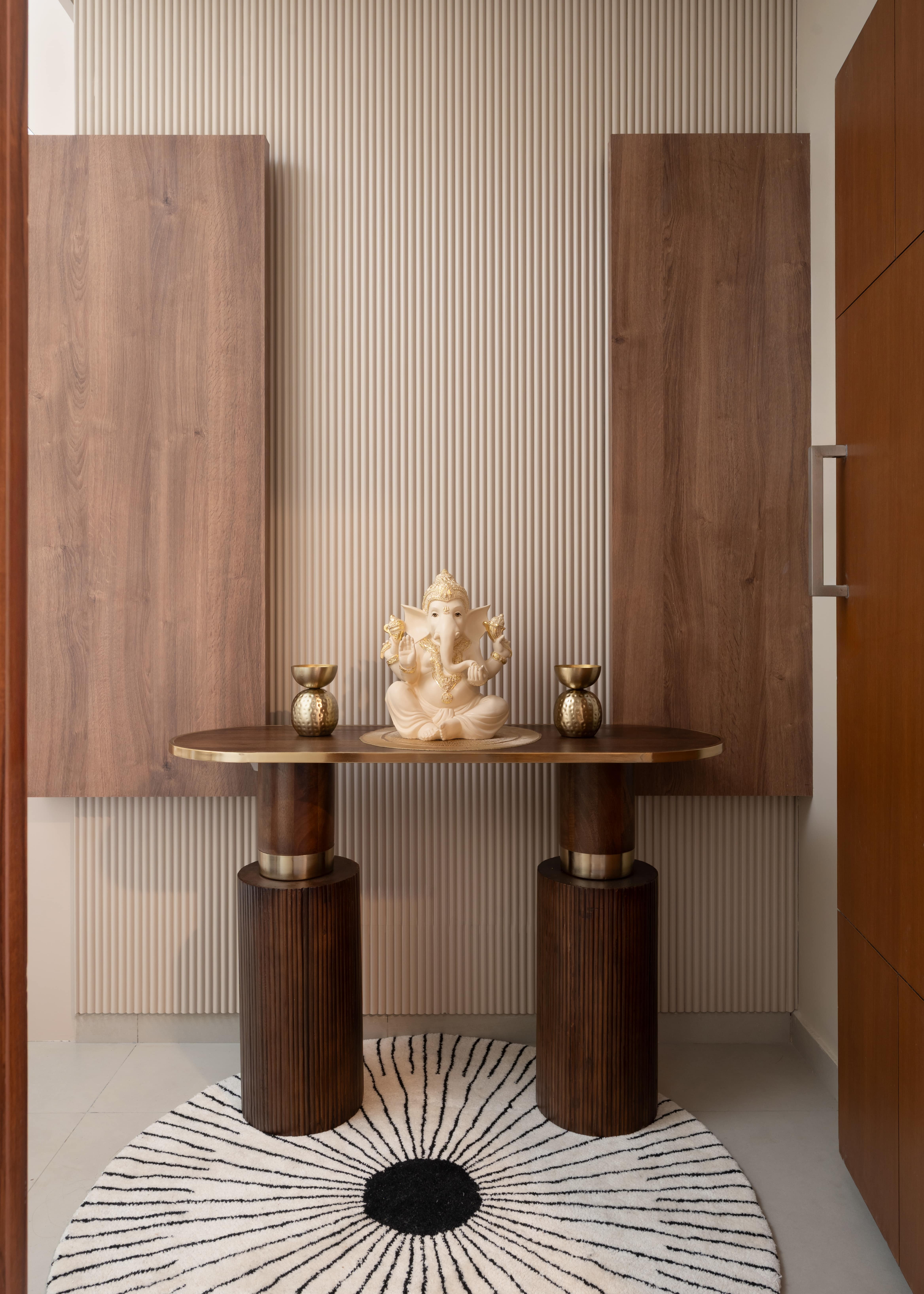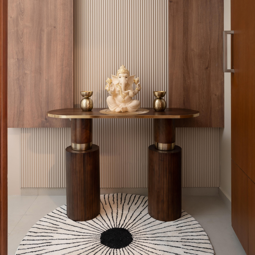 The foyer of Sunny Residence offers a calming welcome with a fluted panel backdrop, sleek wooden console, and serene white Ganesha idol accented in gold—blending warmth and spiritual elegance. The living area continues with neutral-toned seating, textured cushions, curated art, a solid wood coffee table, and touches of greenery and natural light.