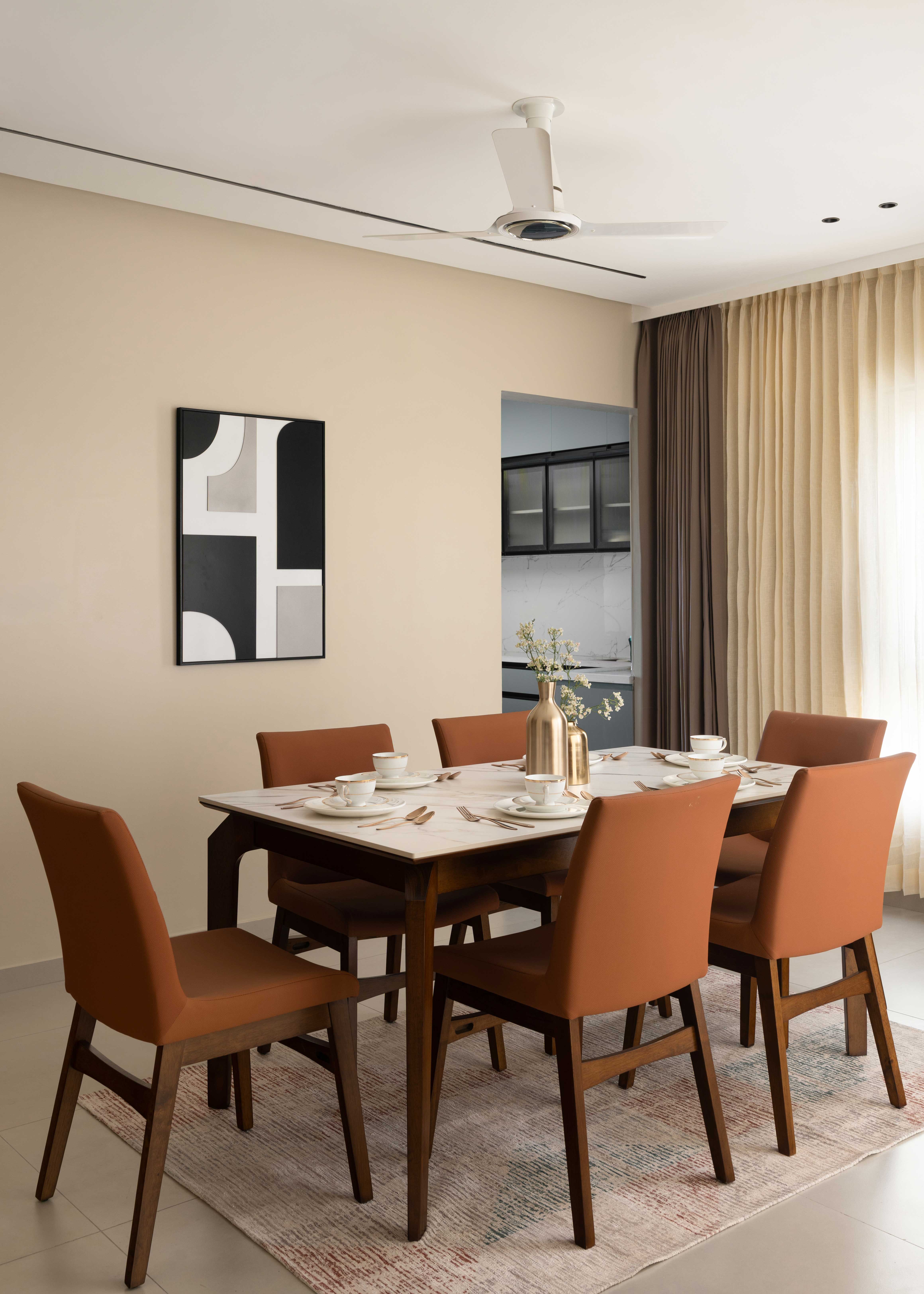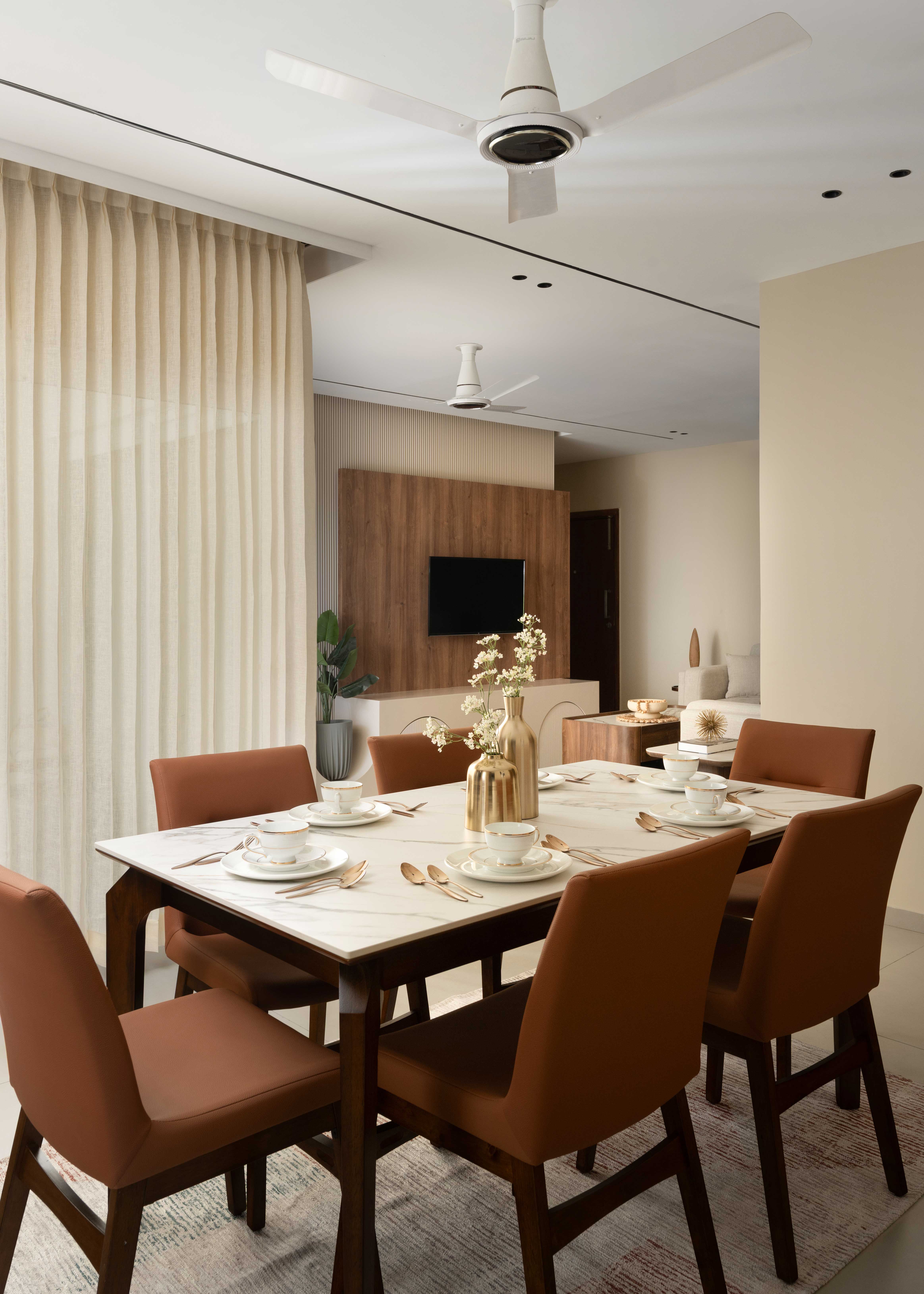 The dining space, with its sleek marble top and chairs, bridges function and style beautifully — creating a warm spot for meals & Entertainment.Subtle touches add an understated luxe feel, while natural light wraps around the home through soft, sheer drapery.
