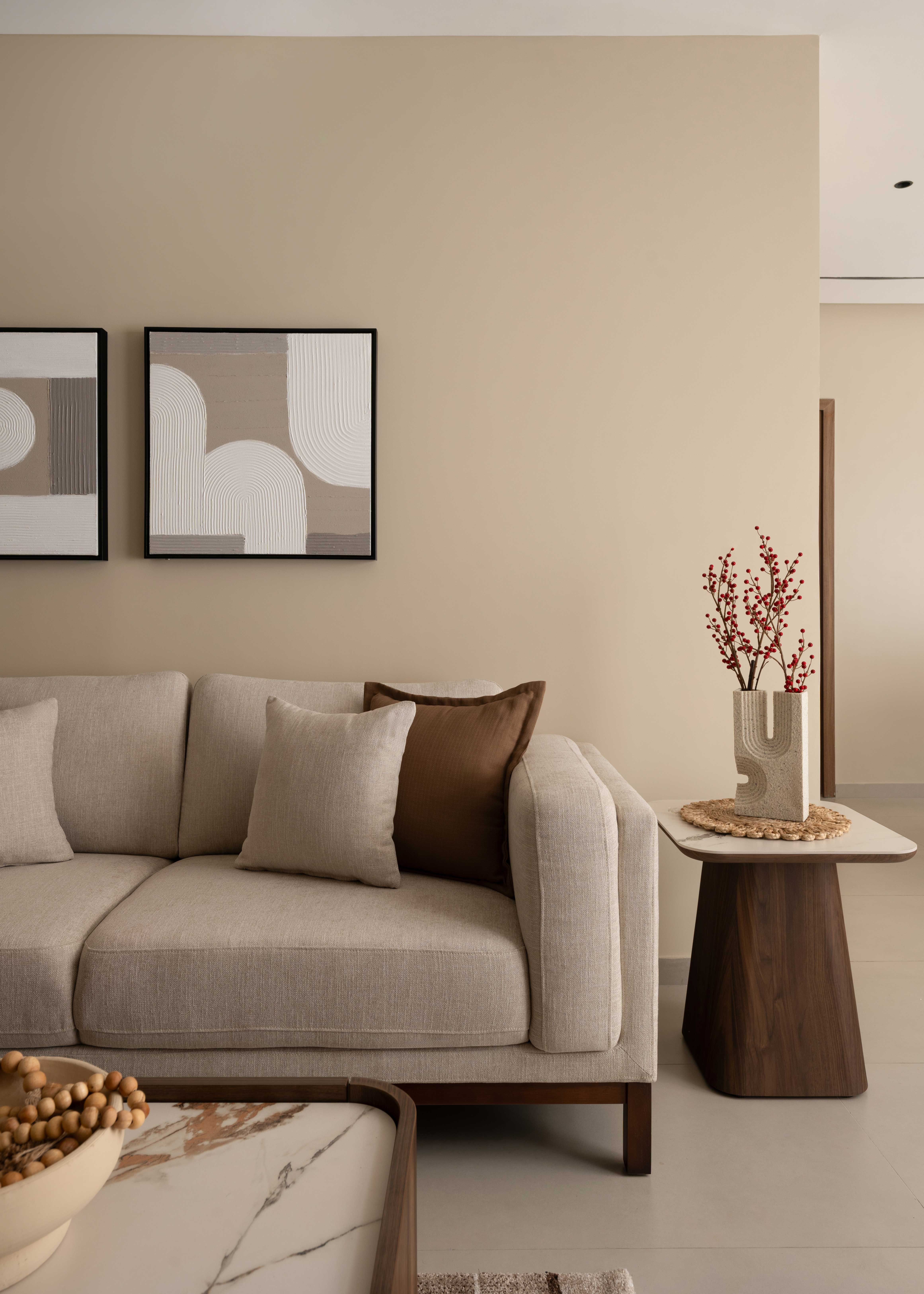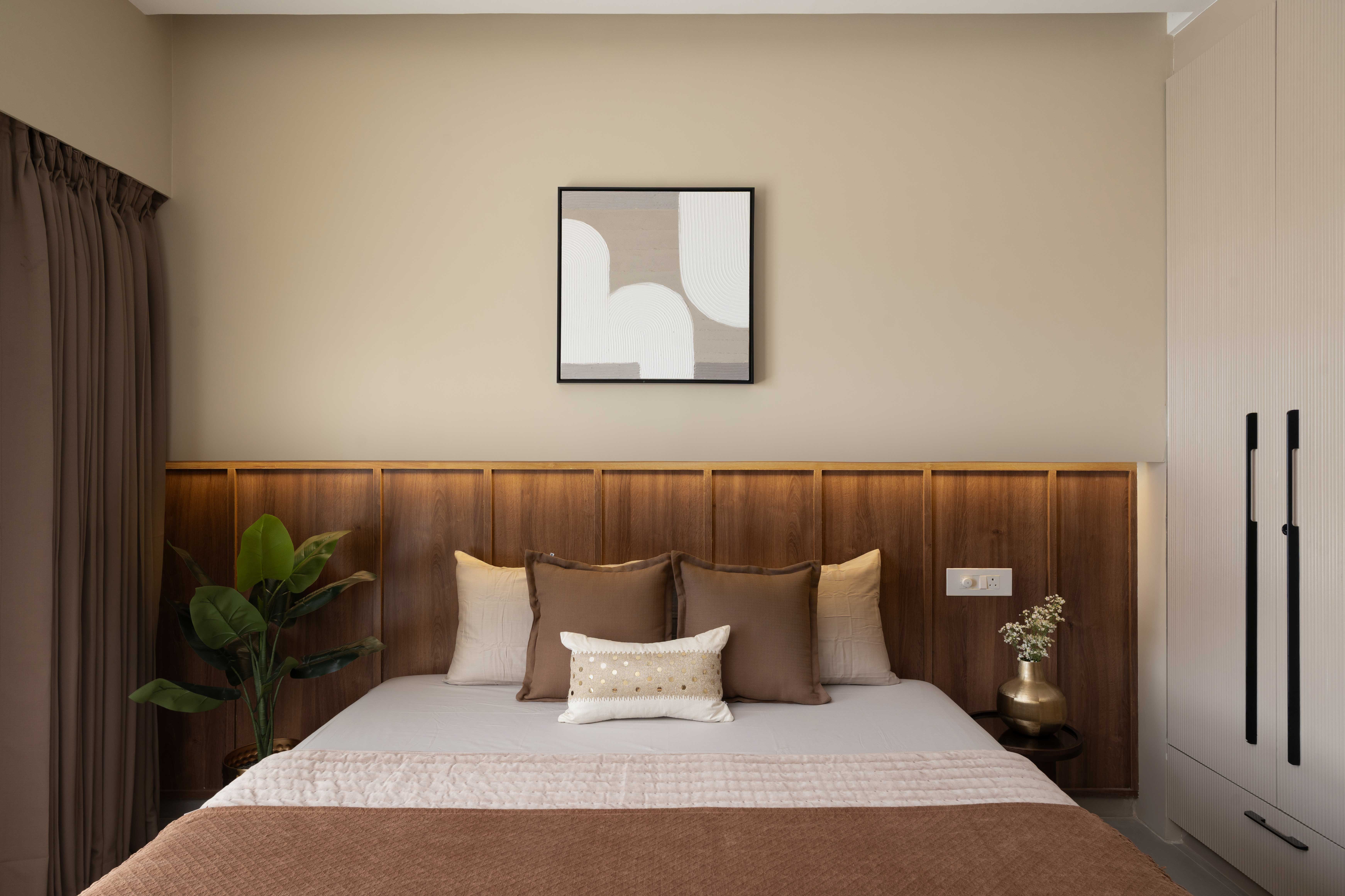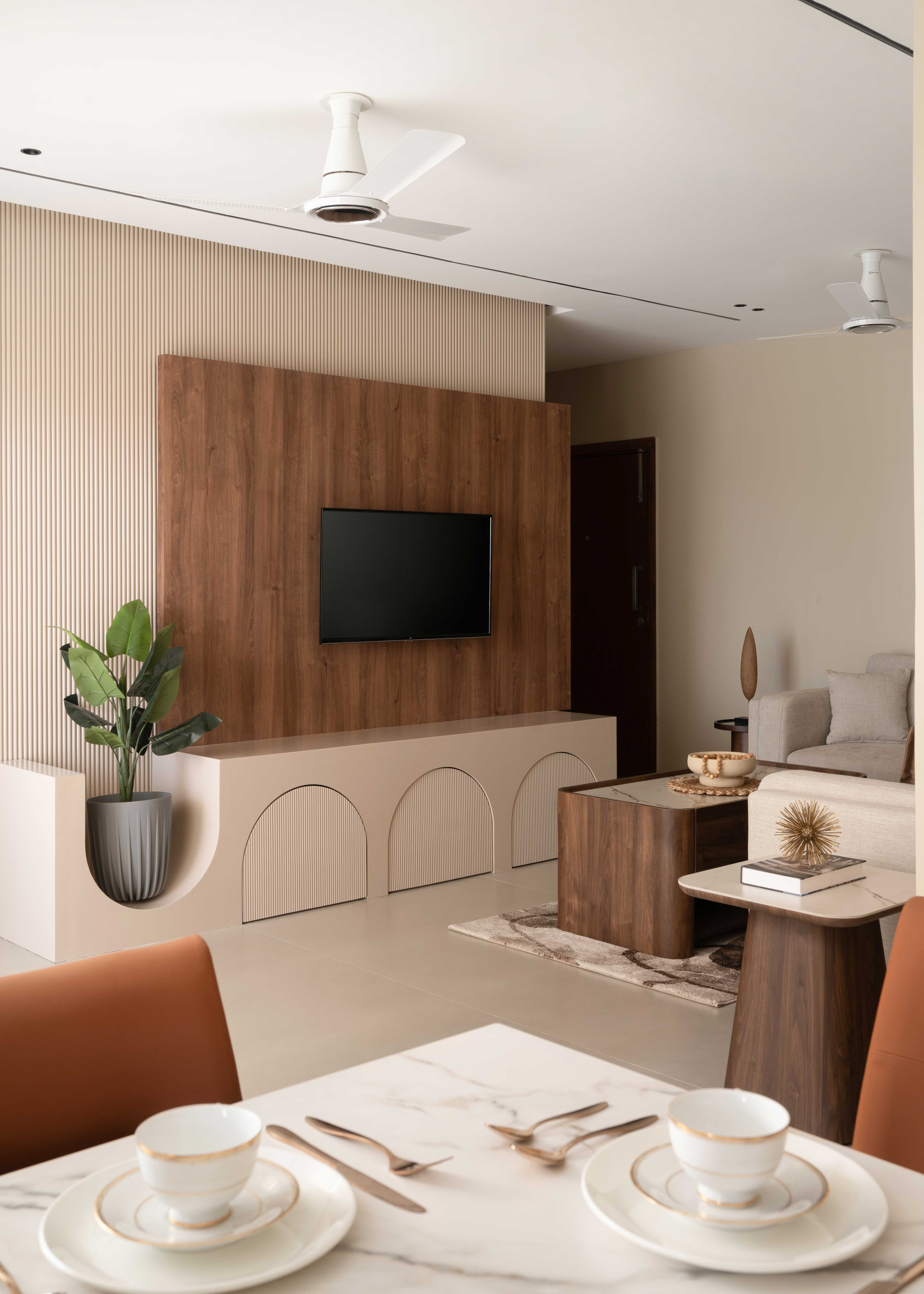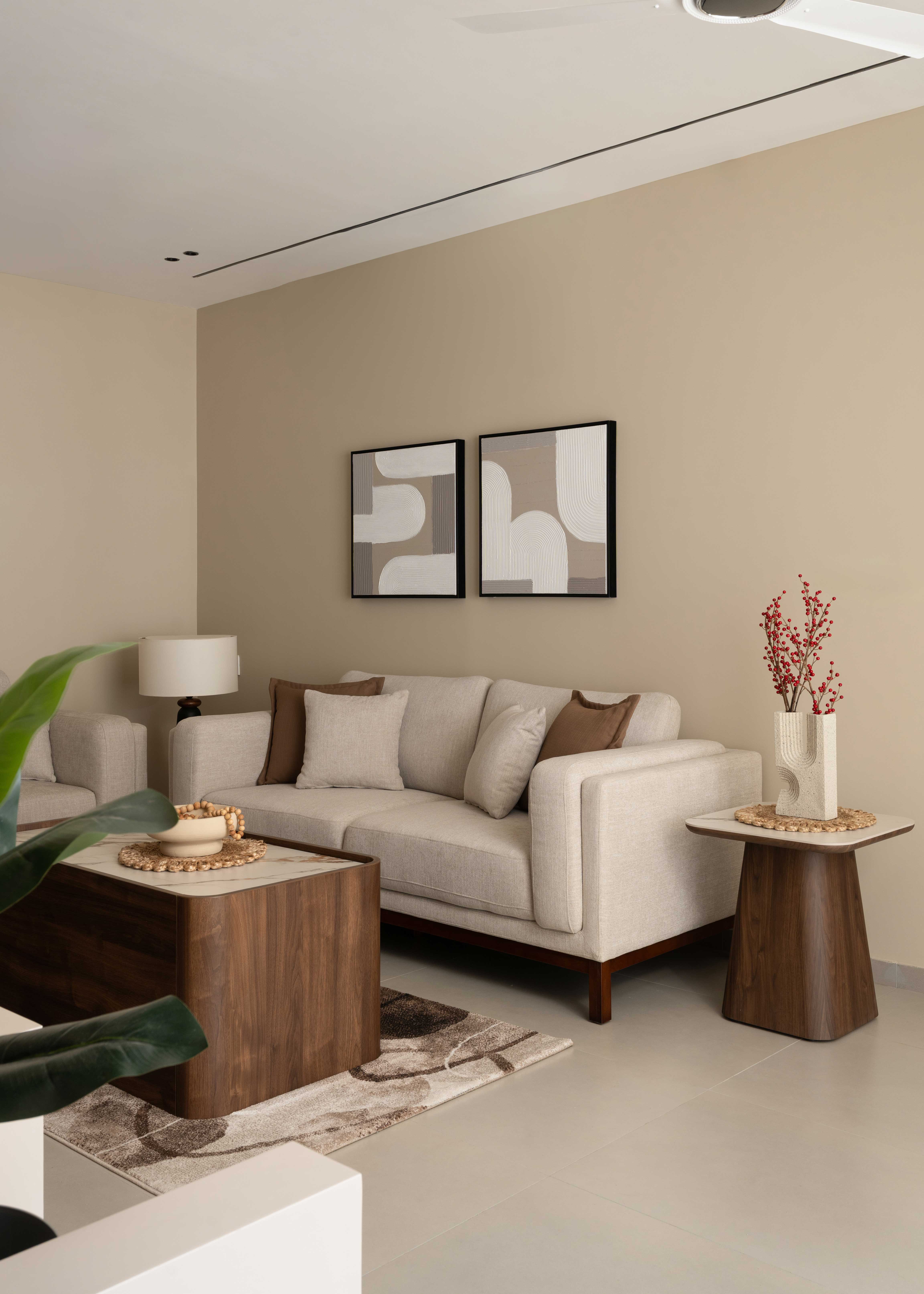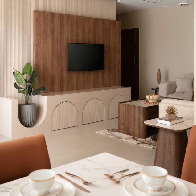 The Sunny Abode is designed in warm shades of beige with rich wooden finishes, tailored to the client’s needs. PU-finished paneling enhances the TV and console units, while a strategically placed plant perfects the angles. Abstract wall art adds a refined touch, making the home feel both elegant and inviting.