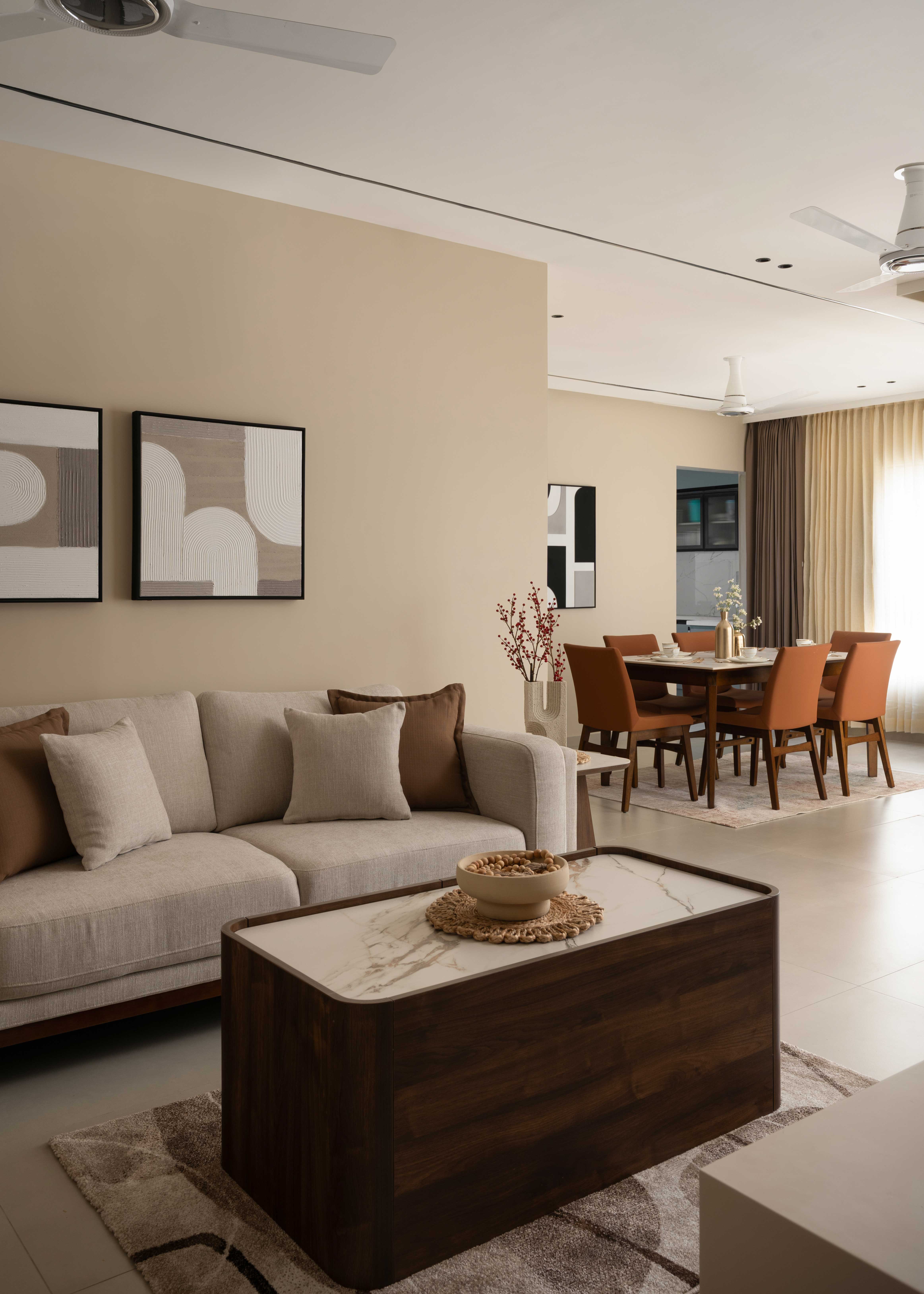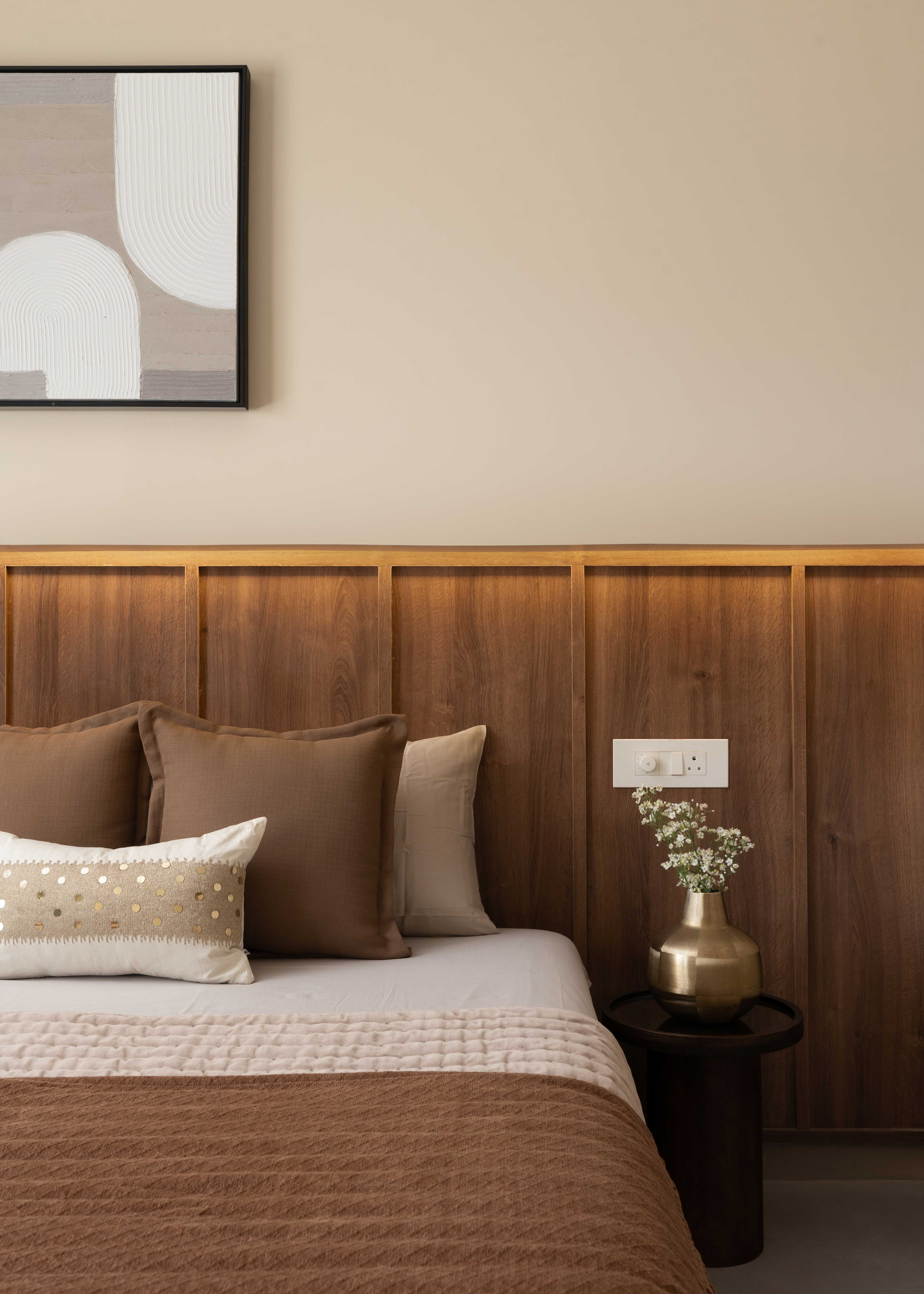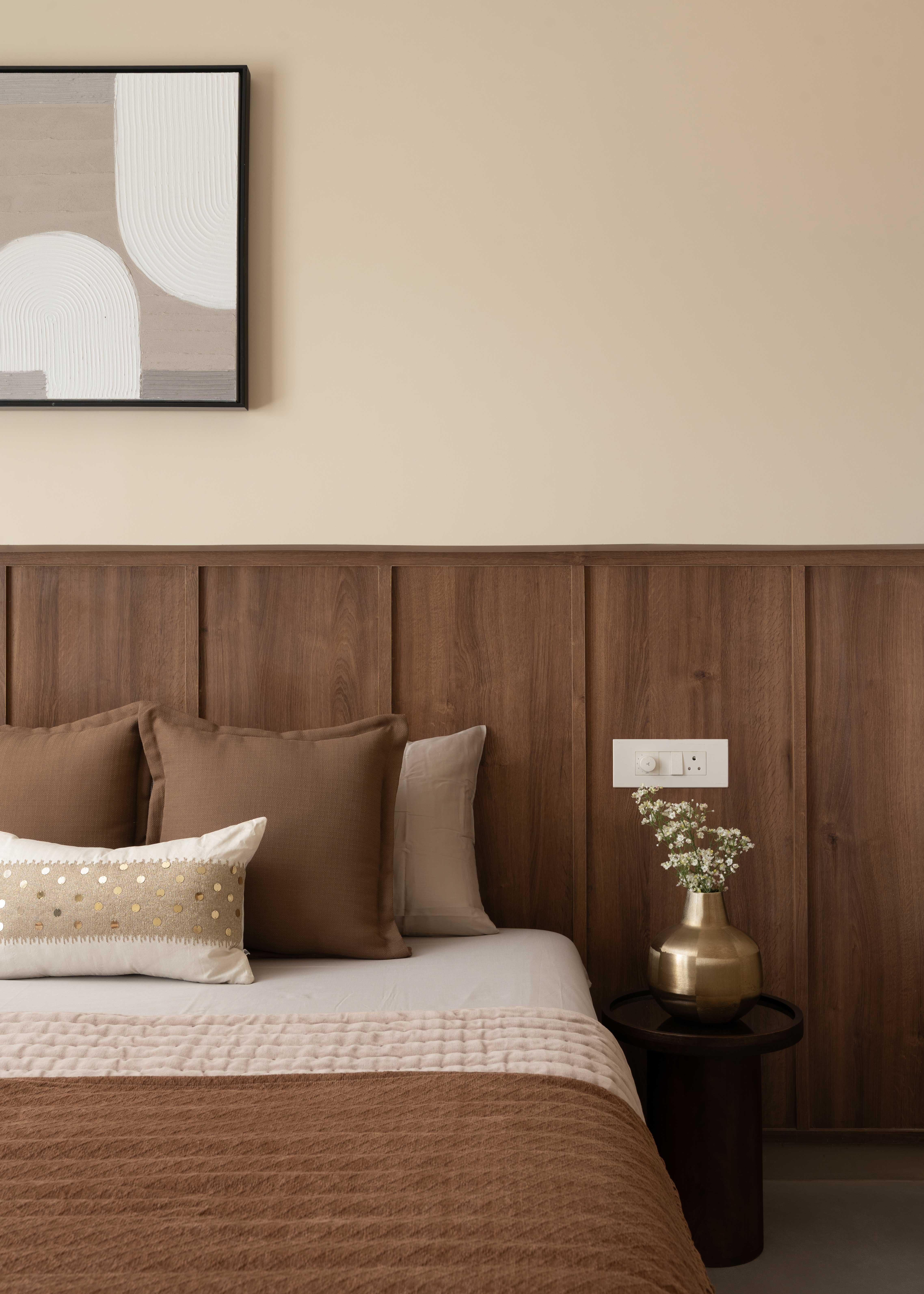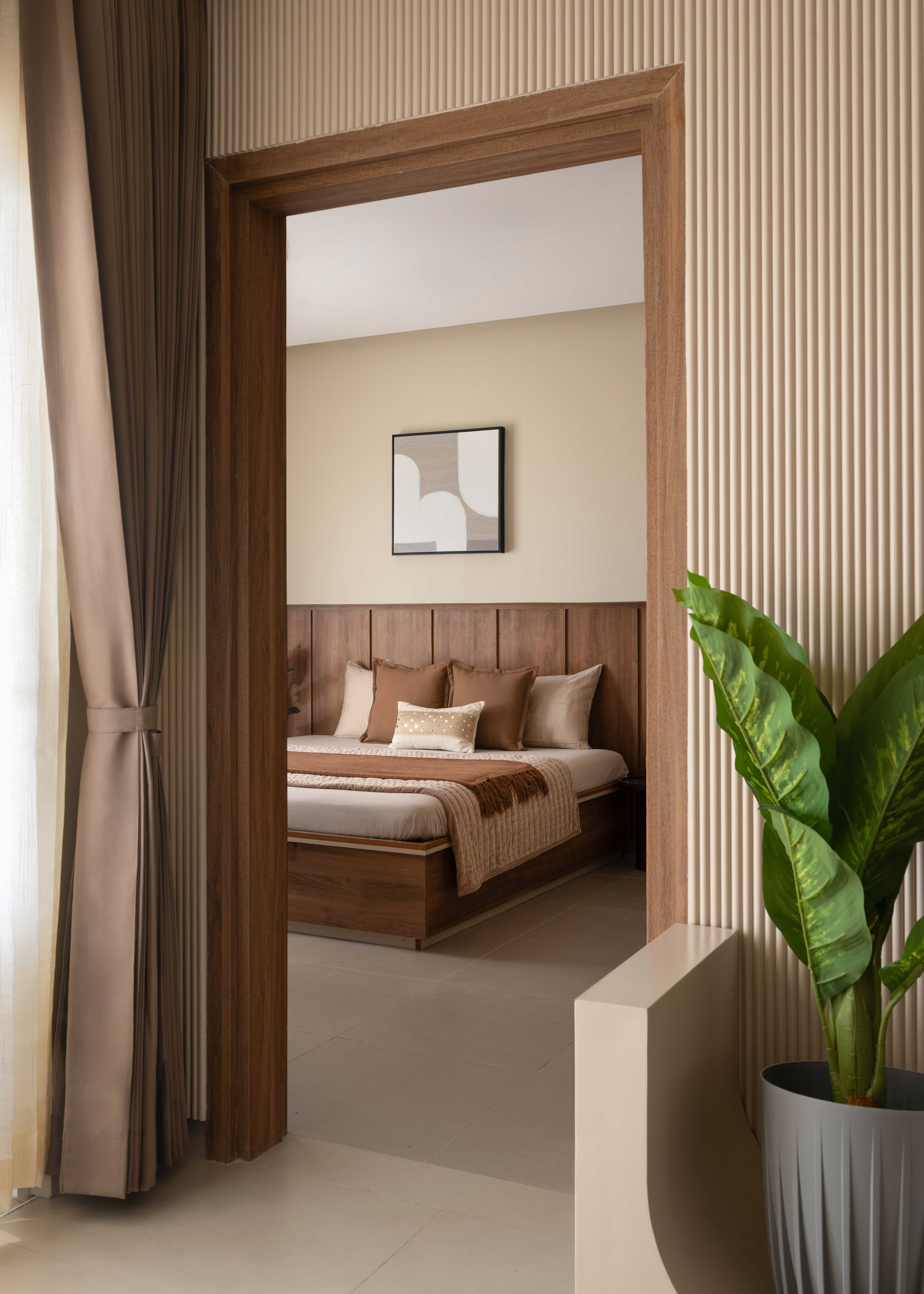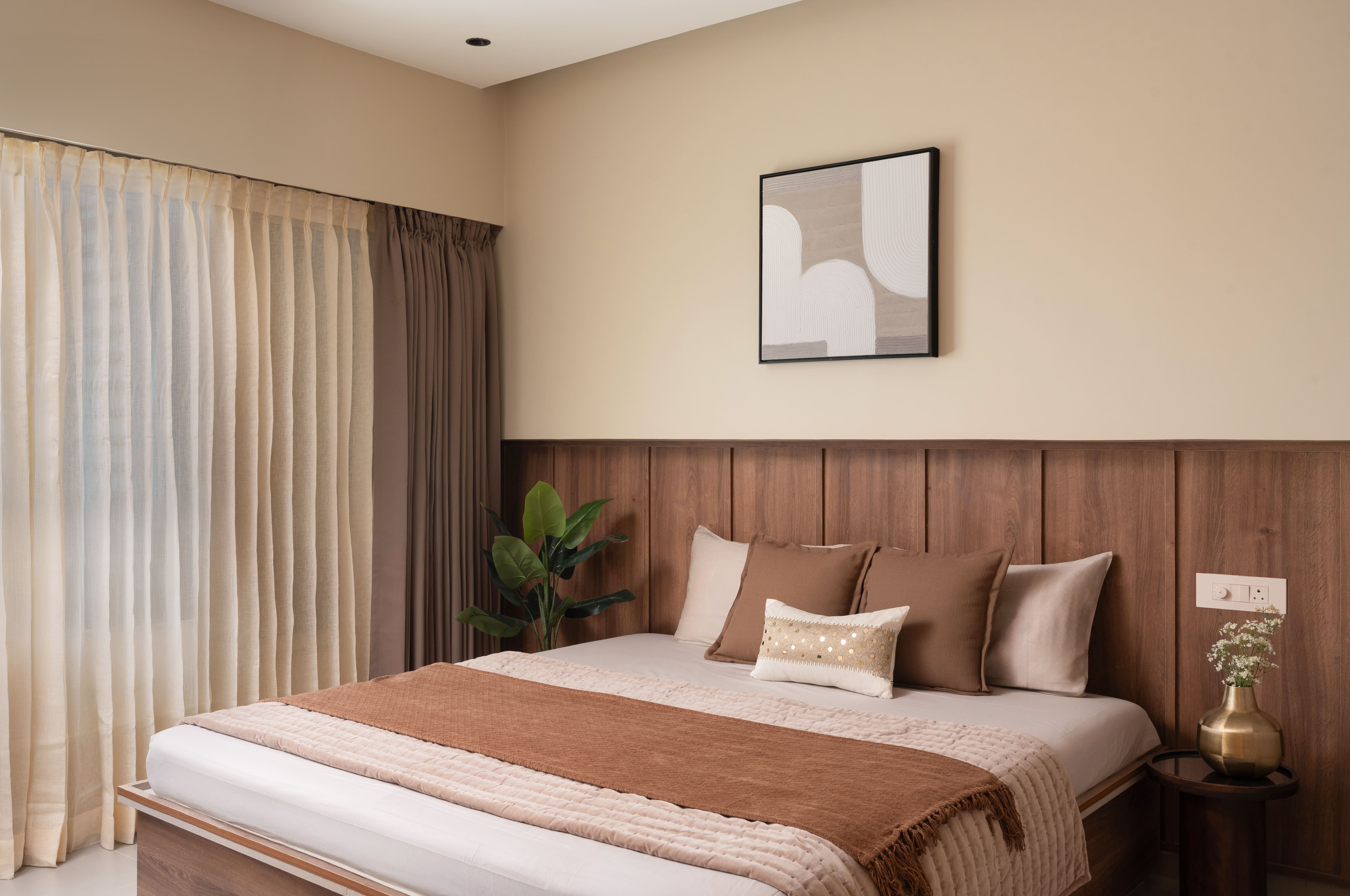 The Sunny Abode is designed in warm shades of beige with rich wooden finishes, tailored to the client’s needs. PU-finished paneling enhances the TV and console units, while a strategically placed plant perfects the angles. Abstract wall art adds a refined touch, making the home feel both elegant and inviting.