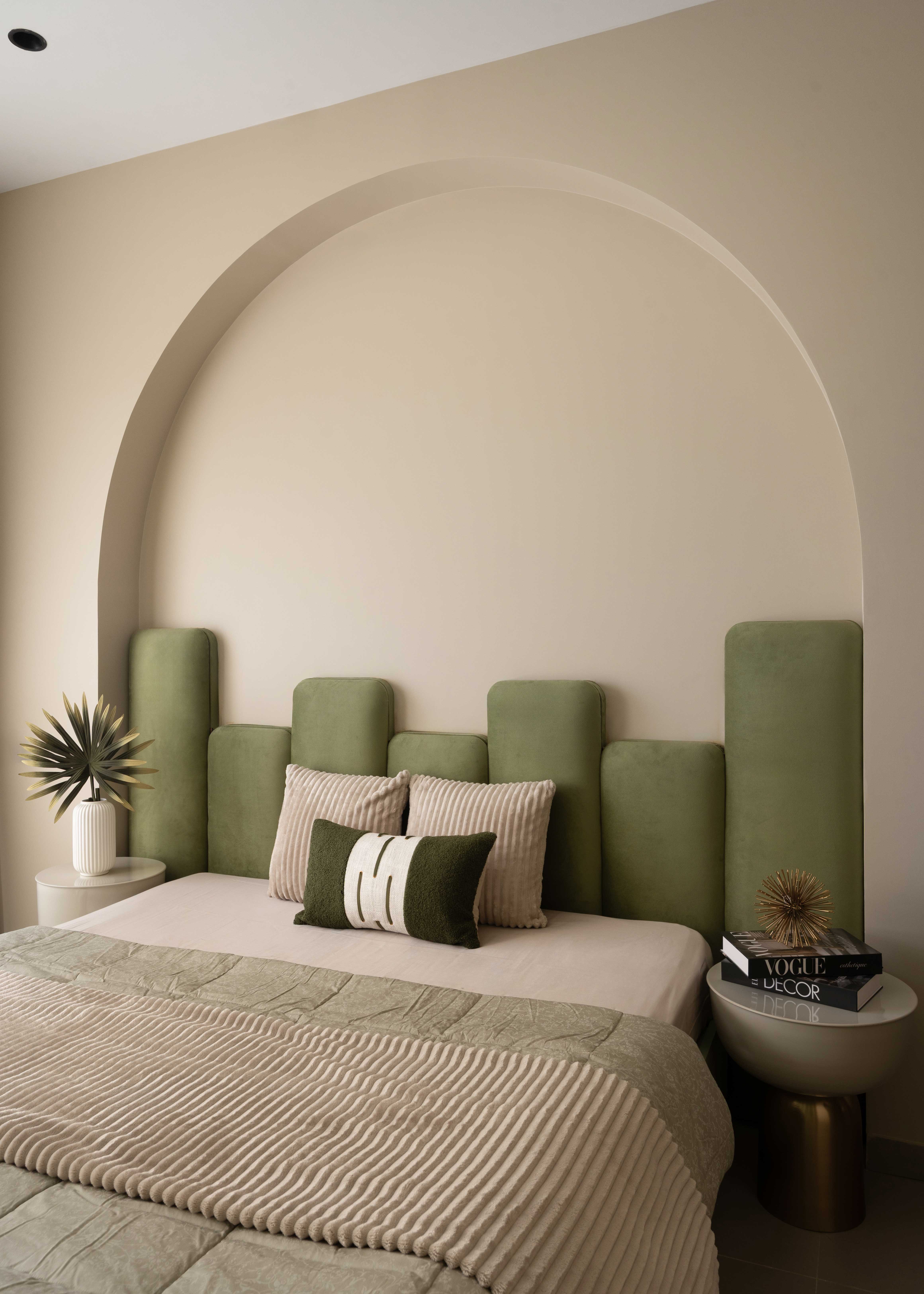 The dining space pairs sophistication with simplicity, featuring a table with burnt orange leather chairs, a woven rug, subtle gold accents, and modern lighting.Each bedroom in Sunny Abode tells its own story — the master, wrapped in warm walnut tones, pairs minimal paneling with an elegant, timeless appeal. The kids’ room, in soothing sage green, features an upholstered back panel and a matching wardrobe, bringing an earthy warmth to this playful yet calming space.