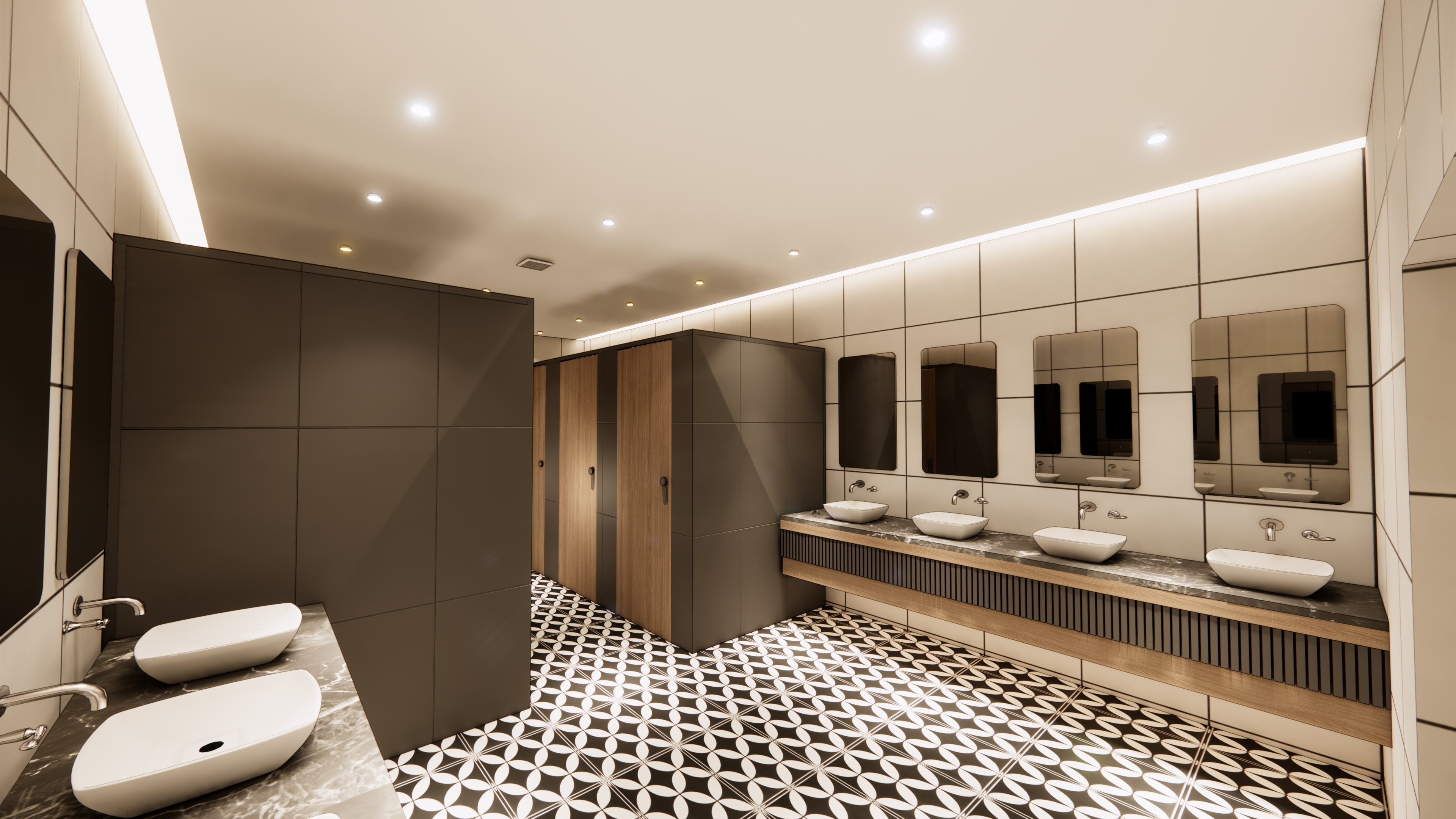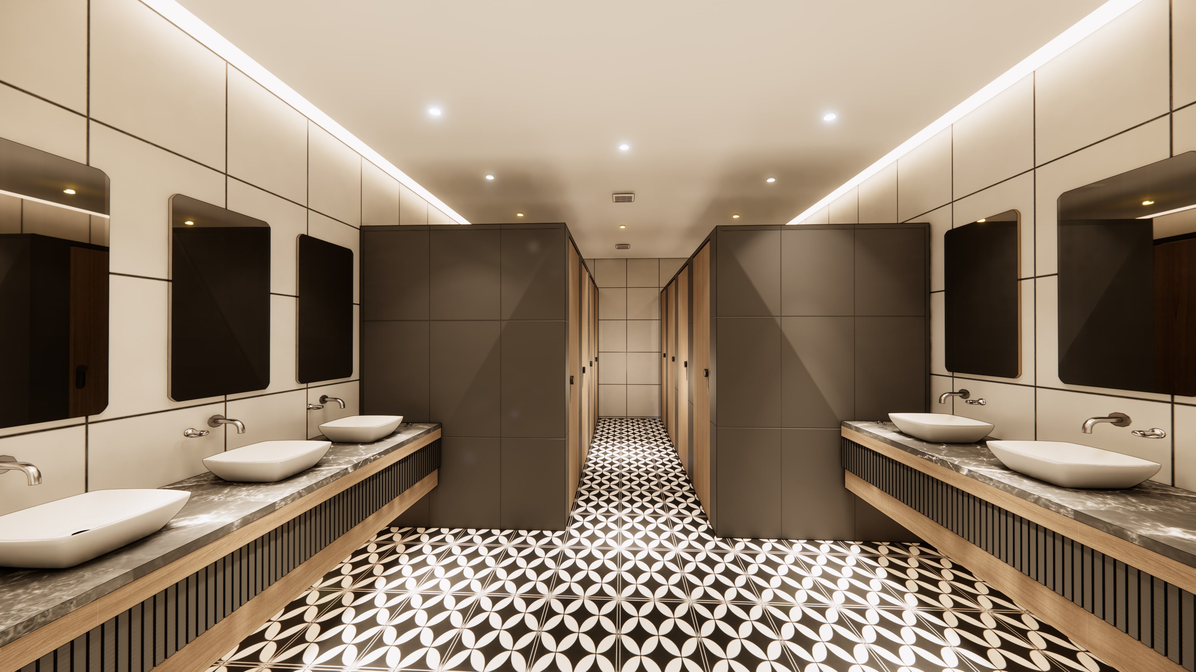Washrooms are finished with cream wall tiles, a portrait mirror, and a fluted